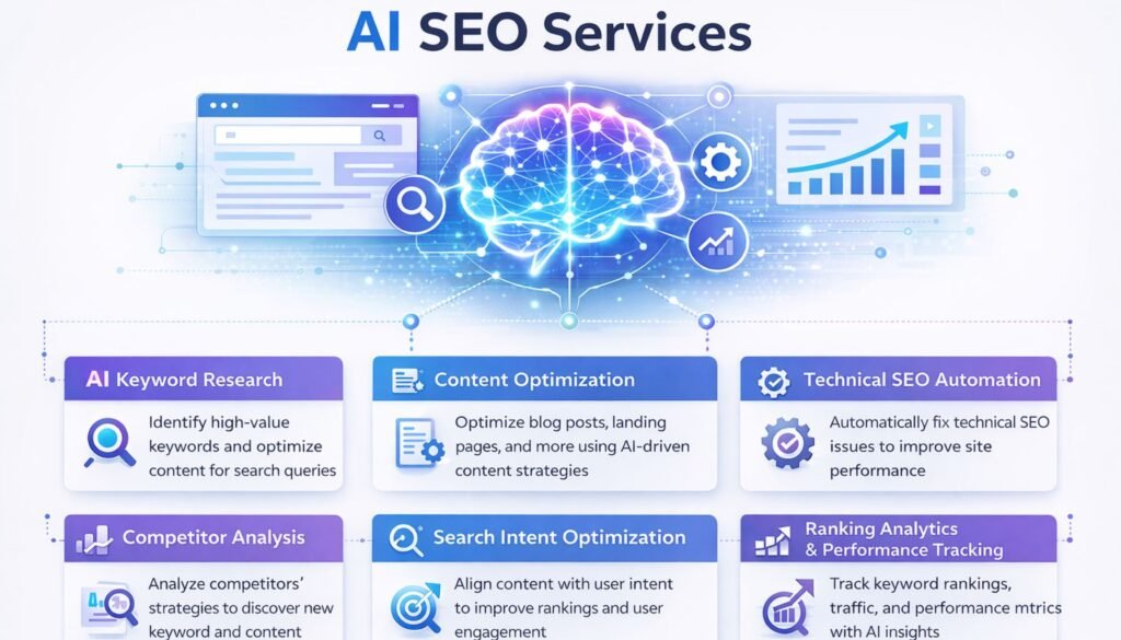 AI SEO services use artificial intelligence tools to automate and improve keyword research, content optimization, technical SEO, and performance analysis.